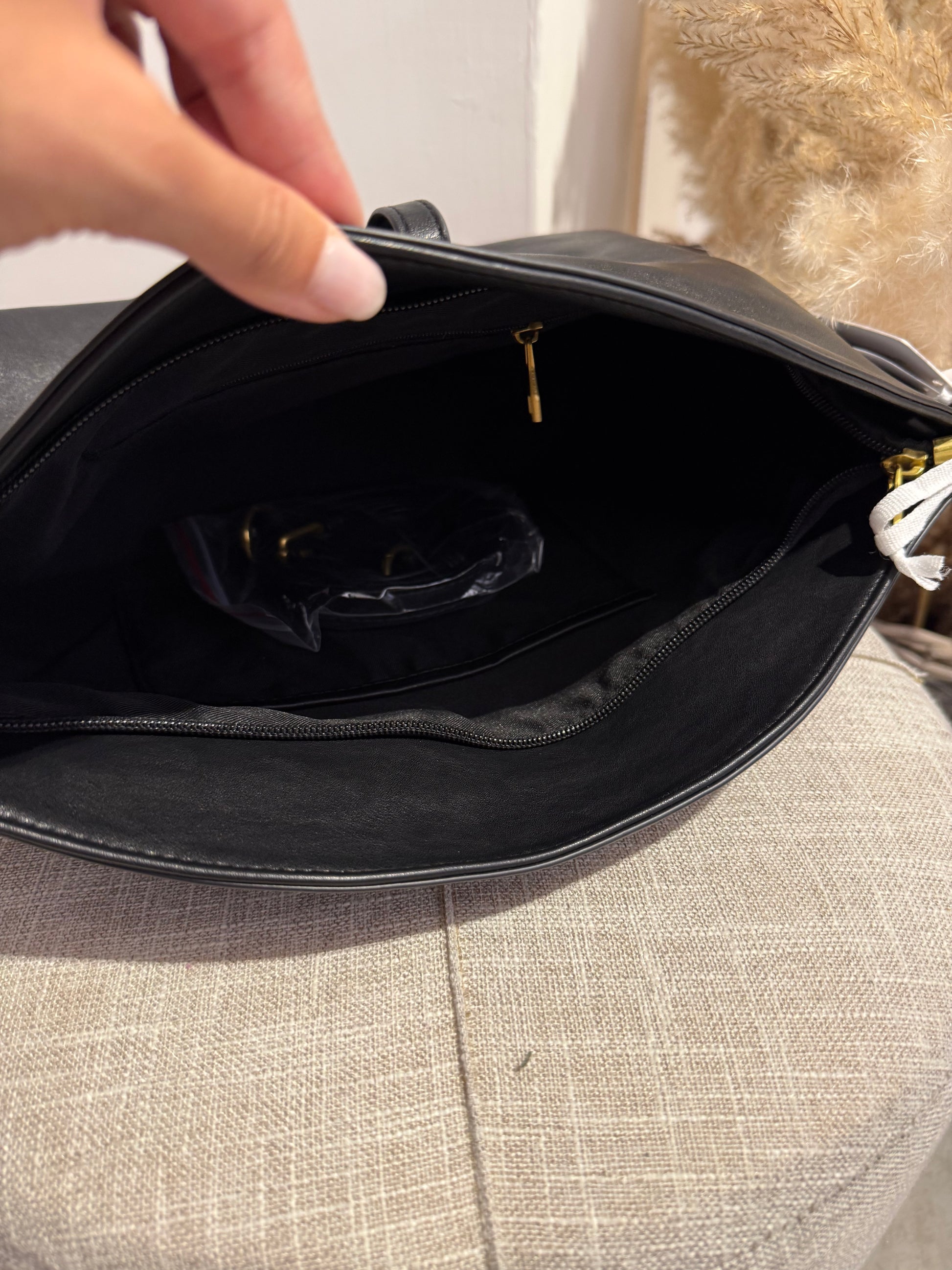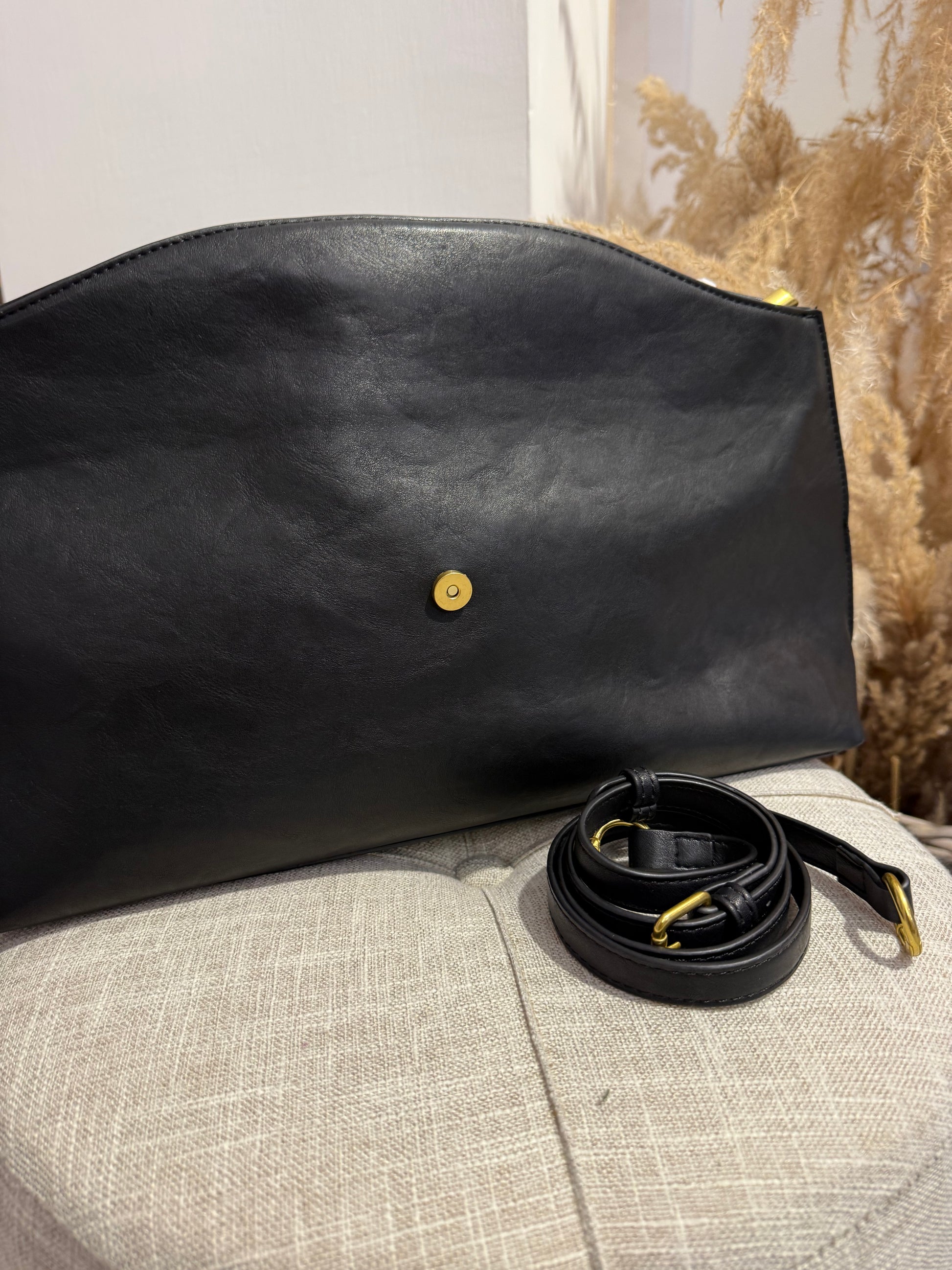 Pochettone in ecopelle con chiusura a calamita e cerniera. Presenza anche la tracolla